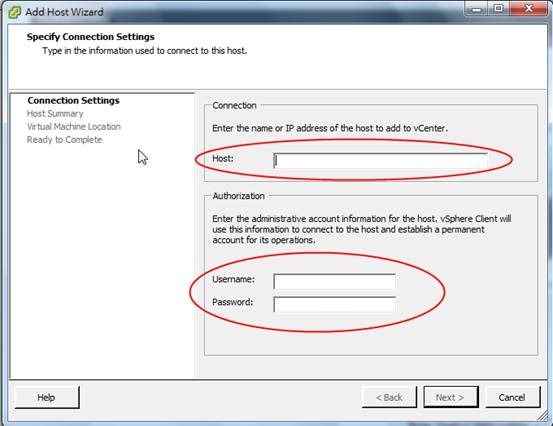 3. 輸入要加入vcenter管控的host ip 及連線的帳號密碼