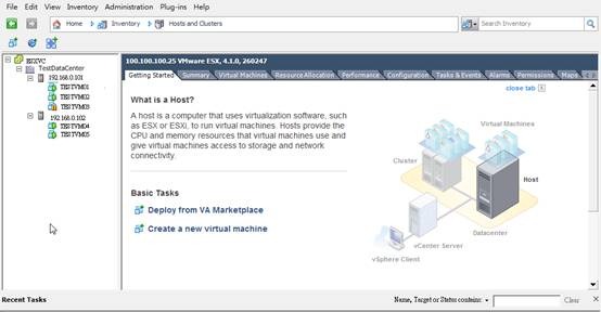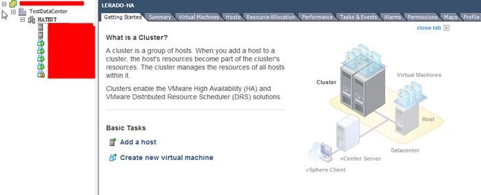 用拖拉的方式將ESX01及ESX02拖入cluster之中就會開始自動設定HA,如果完成後沒錯誤訊息,稍微測試一下,應該就可以看到成效了。(由下圖可看到HATEST中有二台HOST,以及5台VM)