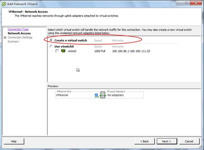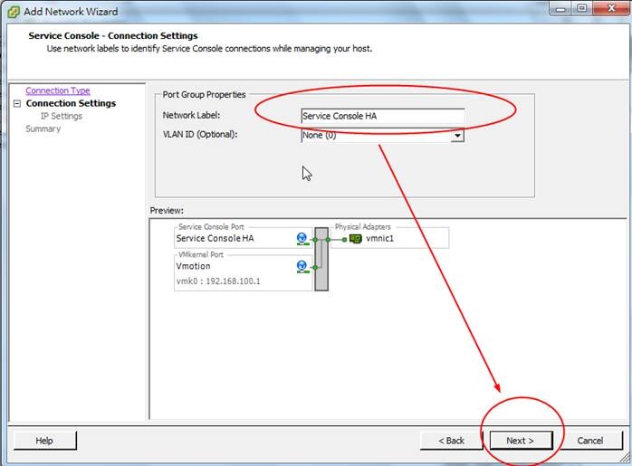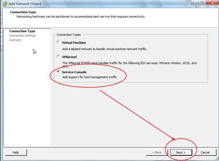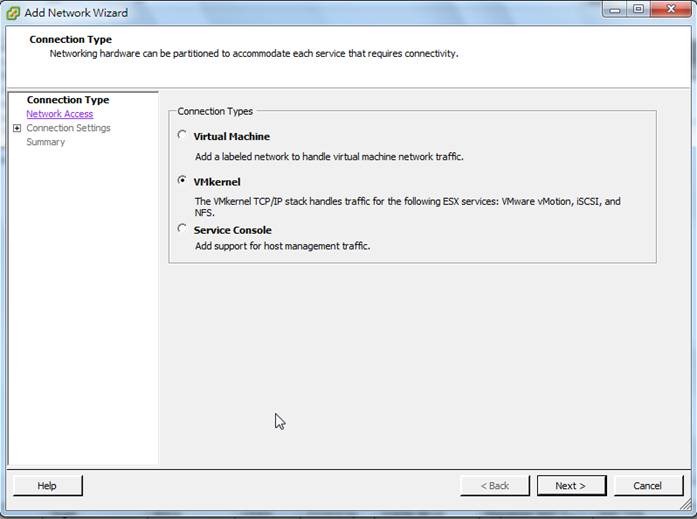 3. 主要要加入二個Connect Type,VMkernel及Service Console,由說明可以看出一個是Vmotion用,另一個是HA用。首先先加入VMkernel進行Vmotion的設定。