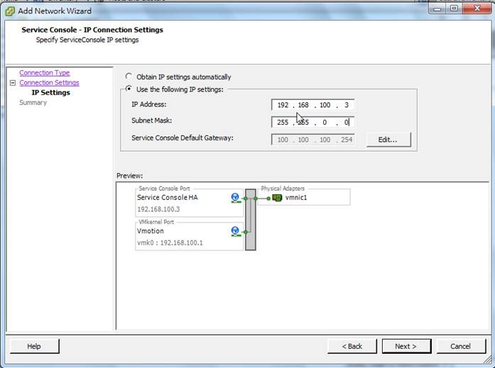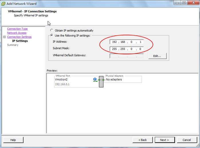 6. 設定VMotion的IP,並按下一步。(ESX01為192.168.0.1,ESX02為192.168.0.2)