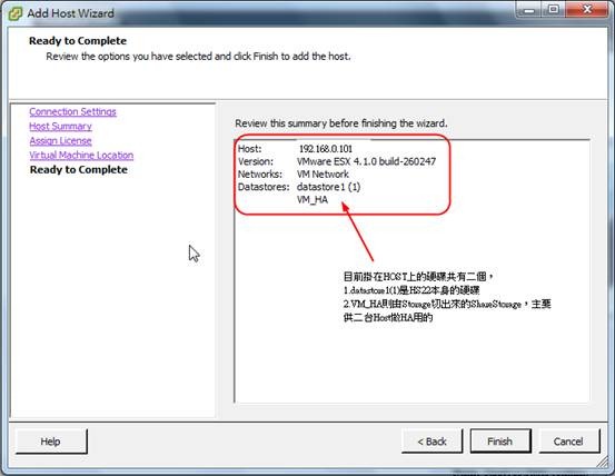1.1)HA用於當其中一台host停止服務時,另一台host會自動接手中止掉的VM,並提供持續的運作。