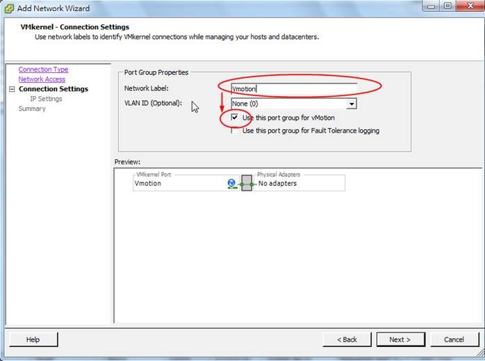 5. 輸入lable並勾選use this port group for Vmotion,按Next。